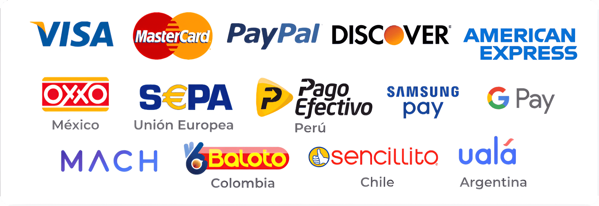 México (Oxxo) Colombia (Efecti) Chile (Sencillito) Perú (PagoEfectivo)